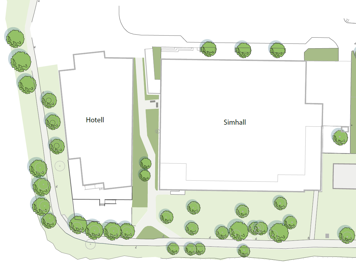 Här bevaras mycket av den uppvuxna växtligheten och utrymmet mellan hotellet och simhallen fylls med planteringar och låg belysning som skapar en trygg passage året om.
